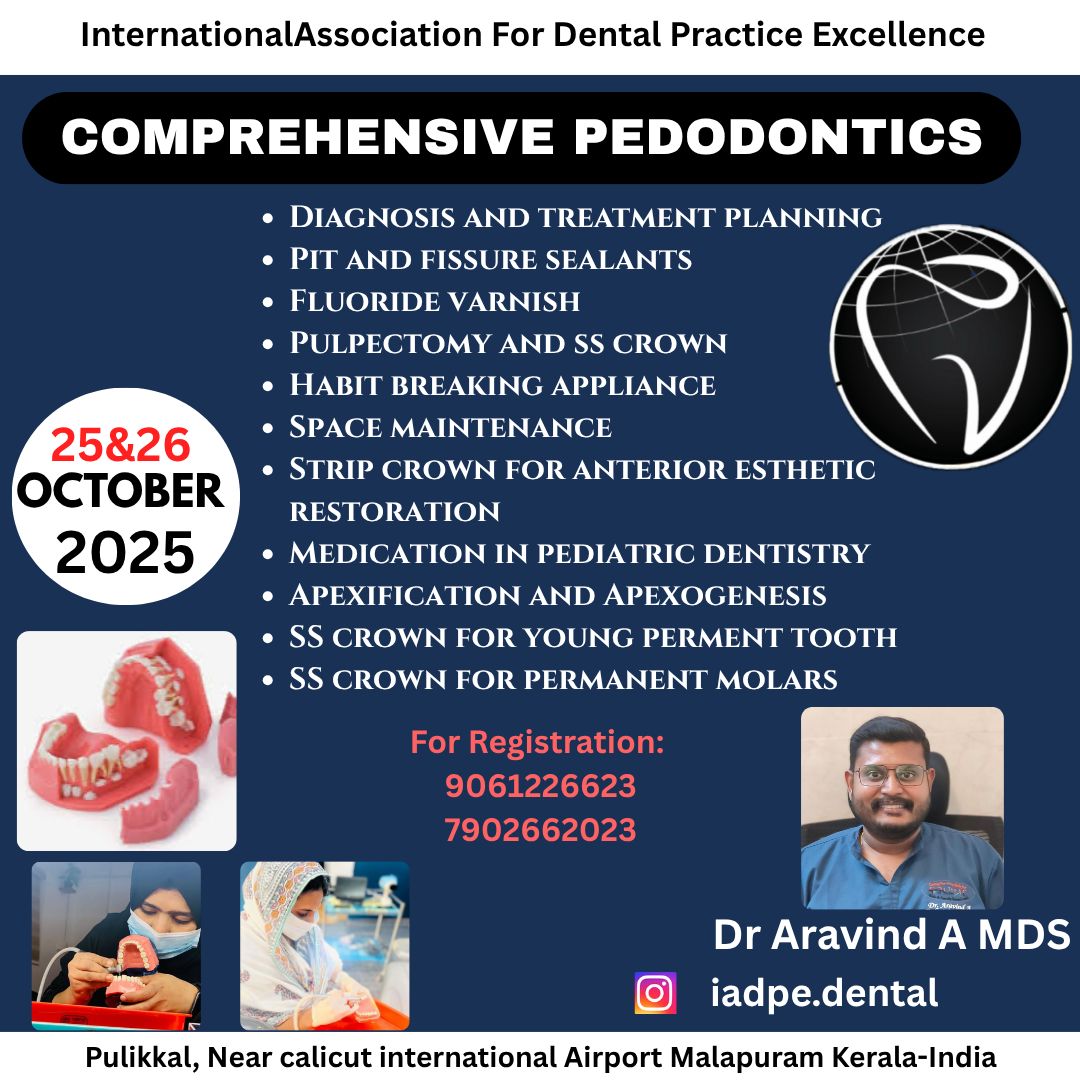 COMPREHENSIVE PEDODONTICS Date: October 25 & 26, 2025 Speaker: Dr. Aravind A MDS Location: Pulikkal, Near Calicut International Airport, Malappuram, Kerala – India Website: iadpe.dental Contact: 9061 22 66 23 | 7902 66 20 23 Topics Covered: Diagnosis and treatment planning Pit and fissure sealants Fluoride varnish Pulpotomy and SS crown Habit breaking appliance Space maintenance SS crown for anterior esthetic restoration Medication in pediatric dentistry Apexification and apexogenesis SS crown for young permanent tooth SS crown for permanent molars
