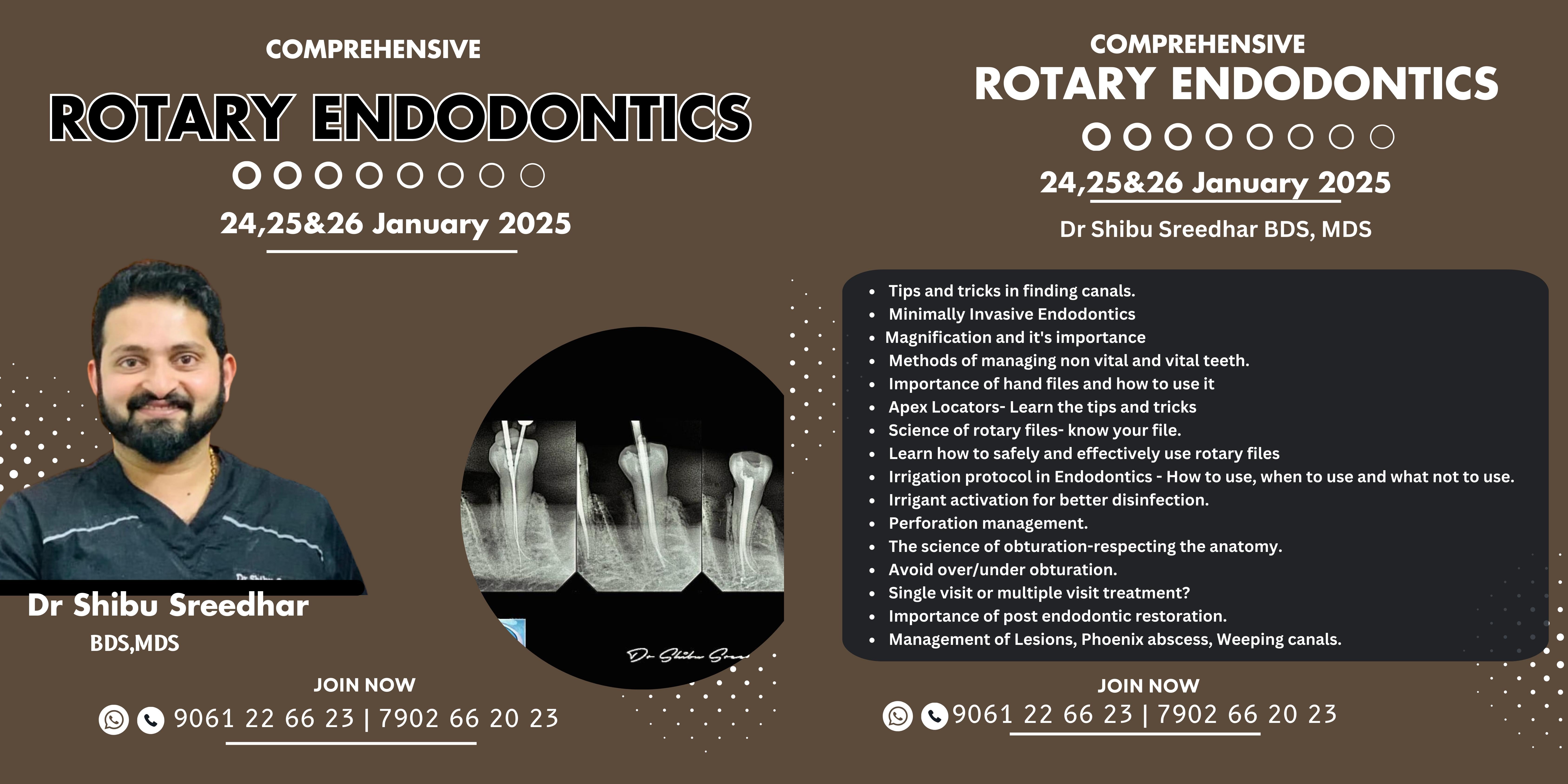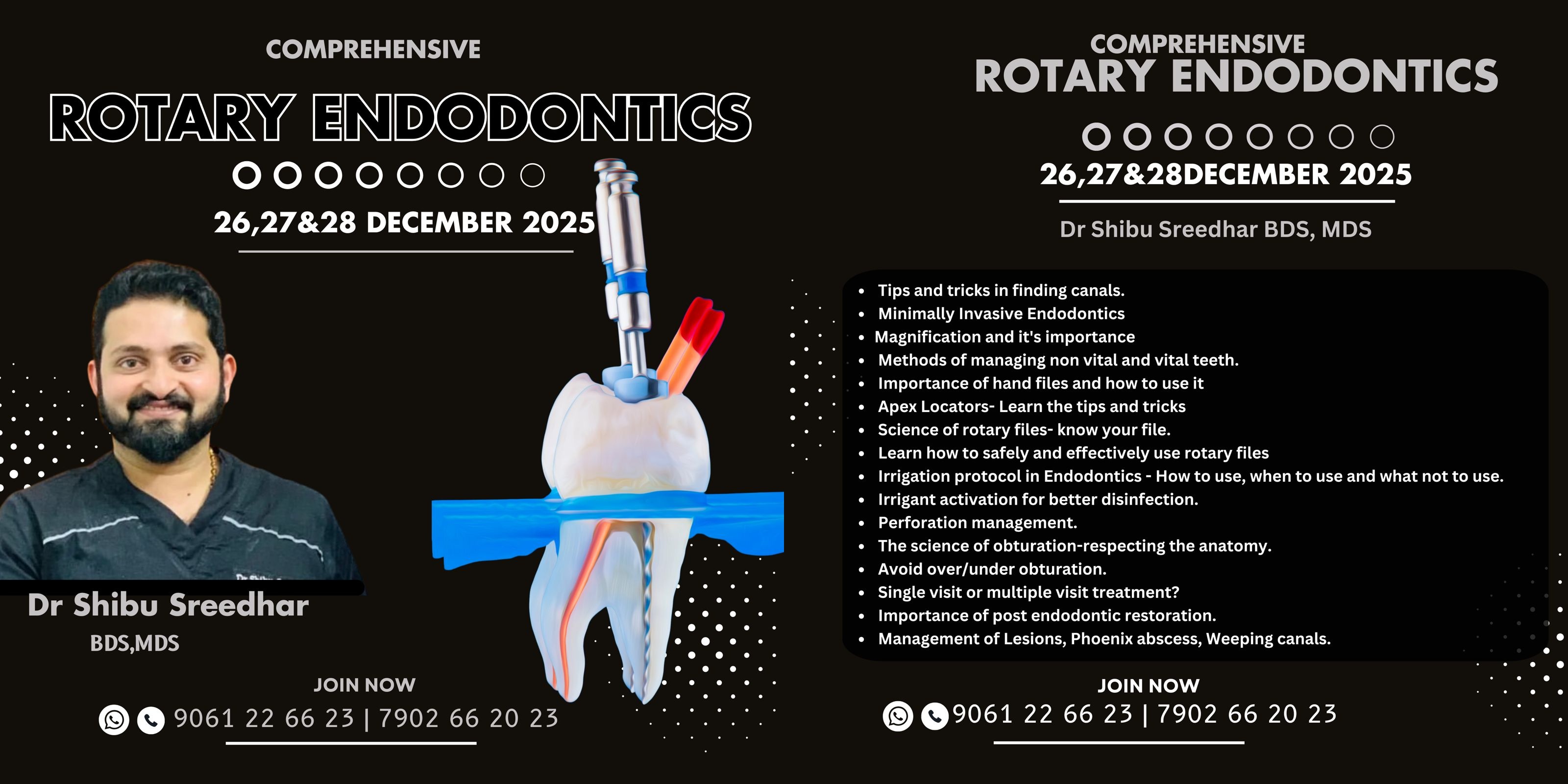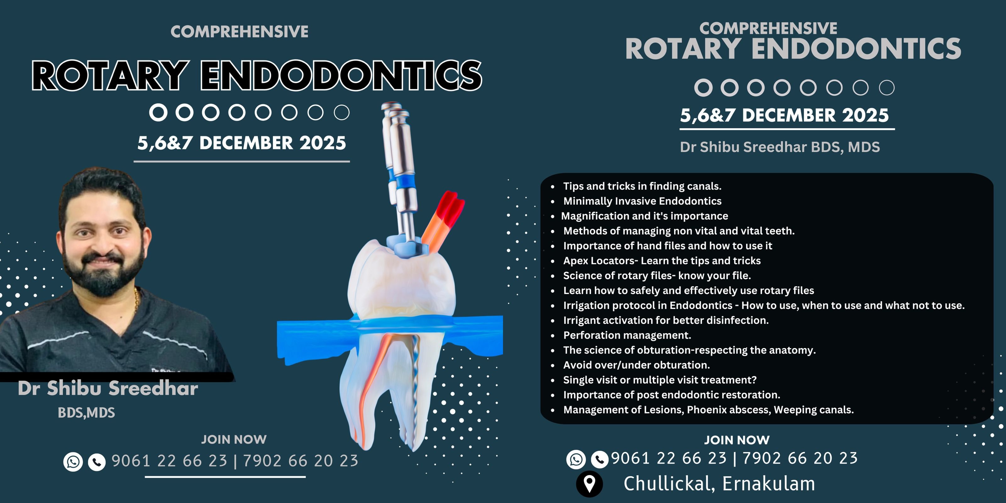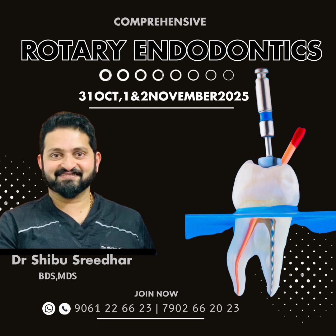 Comprehensive Rotary Endodontics Course Dates: December 26, 27 & 28, 2025 Instructor: Dr. Shibu Sreedhar, BDS, MDS Contact: 9061 22 66 23 7902 66 20 23 Topics Covered: Tips and tricks in finding canals Minimally invasive Endodontics Magnification and its impact Importance of radiographic and vital tooth Role of CBCT in Endodontics Apex Locators – tips and tricks Early diagnosis in Endodontics Importance of irrigation and its impact Irrigation protocol – how, when, and what to use Irrigation activation for better results Science of obturation—respecting anatomy Importance of 3D obturation Management of: Calcified canals Lesions Perforations Weeping canals