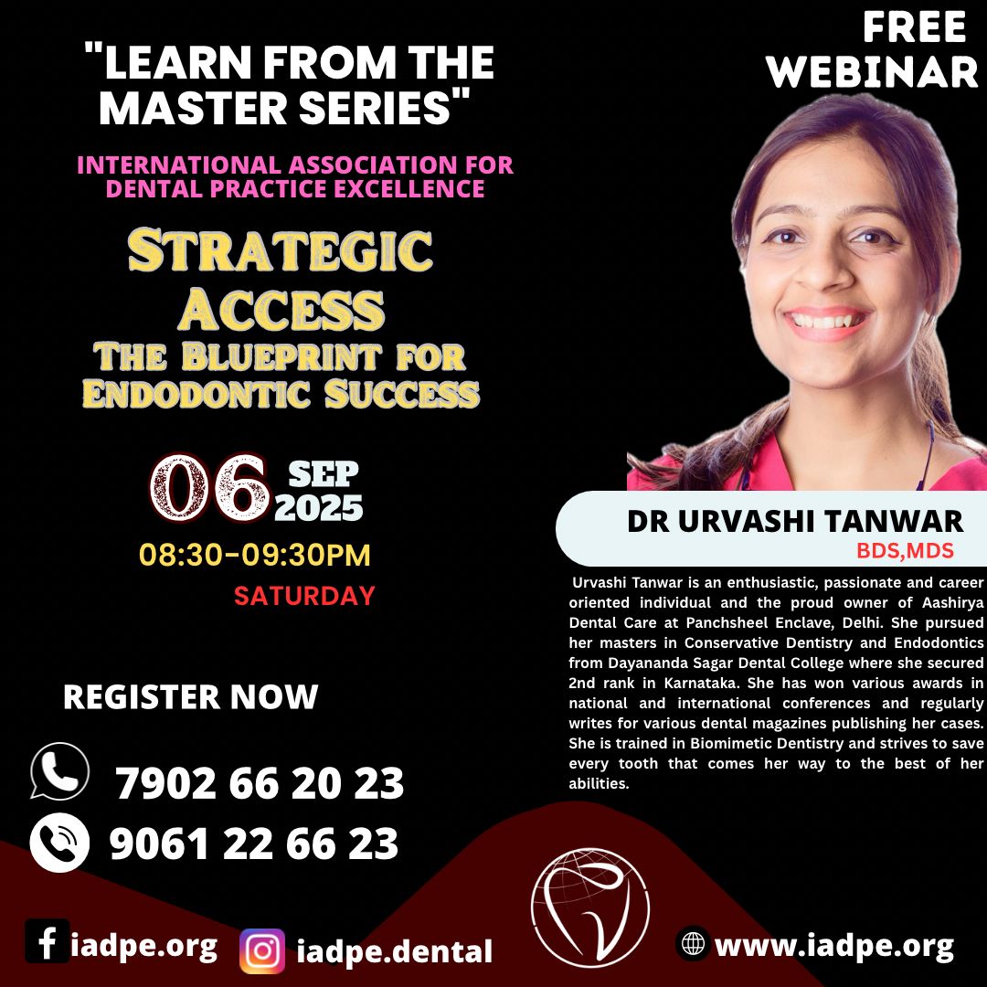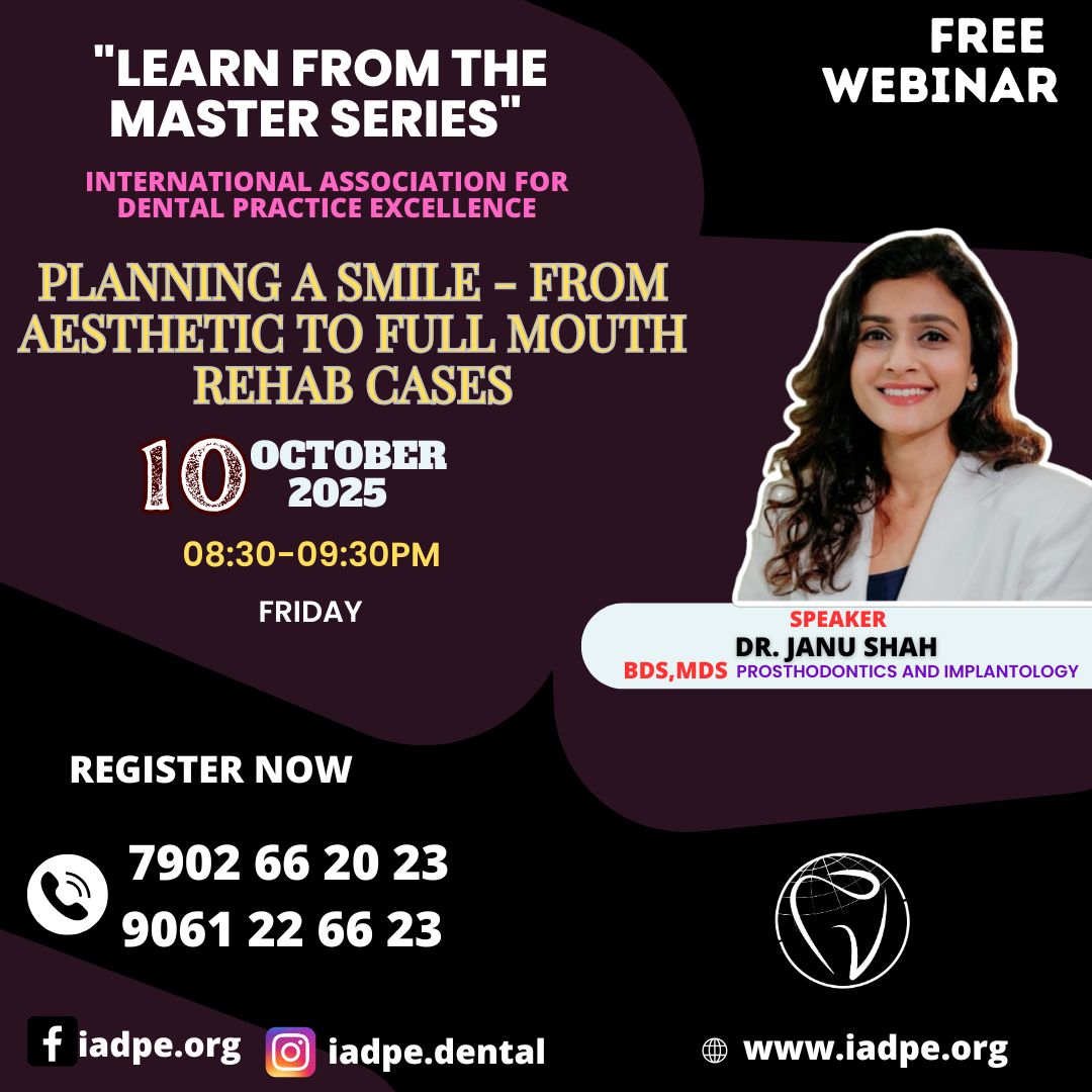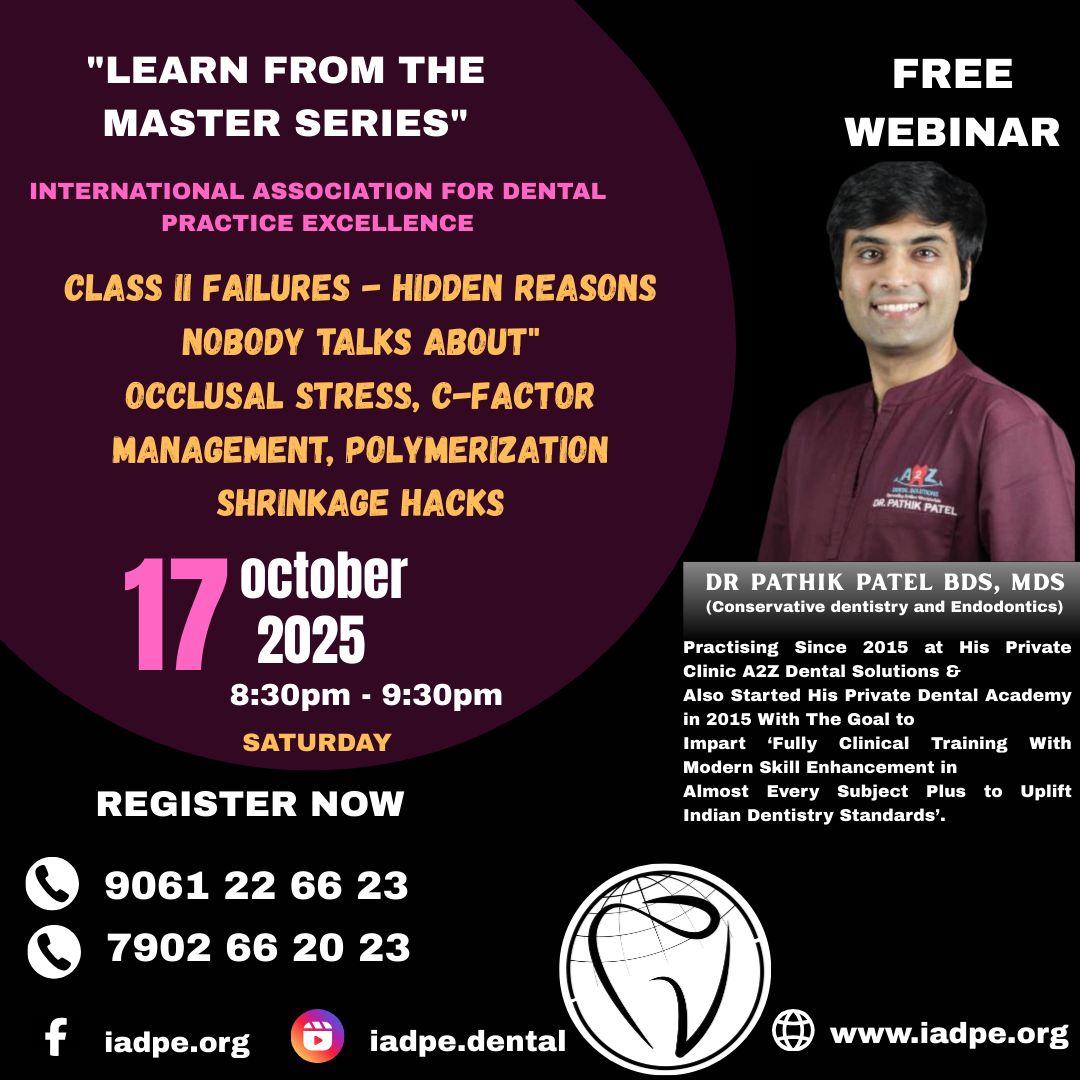 Learn from the Master Series Free Webinar by the International Association for Dental Practice Excellence Topic: Class II Failures – Hidden Reasons Nobody Talks About Occlusal Stress, C-Factor Management, Polymerization Shrinkage Hacks Date & Time: Saturday, October 17, 2025 8:30 PM – 9:30 PM Speaker: Dr. Pathik Patel, BDS, MDS Specialist in Conservative Dentistry & Endodontics Winner of India’s Best Young Dentist (2015) Founder of Private Dental Academy (2015) Renowned educator and clinician in restorative dentistry Registration & Contact: Phone: 9061 22 66 23, 7902 66 20 33 Instagram: @iadpe Website: www.iadpe.dental This webinar is perfect for dental professionals looking to deepen their understanding of restorative challenges and elevate their clinical outcomes.