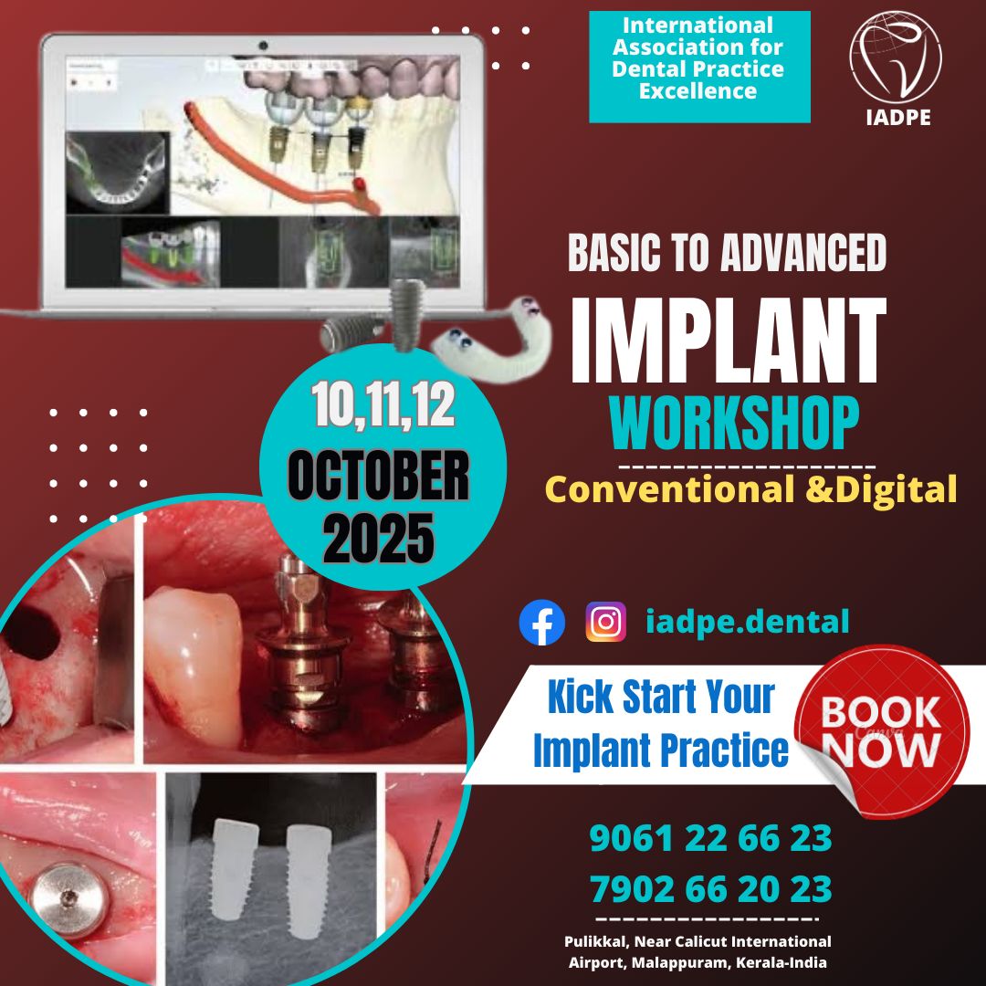 10,11,12 October 2025 Basic to Advanced Implant Workshop Organized by: International Association for Dental Practice Excellence Format: Hands-on, Demonstration-Based, One-on-One Instruction Surgical Phase: Conventional & Digital Topics Covered: Introduction to Implantology Incisions and suture techniques – demo Bone structure overview – hands-on Implant components and their significance Surgical phase discussion with dummy implant placement Implant Kit Demonstration Single and dummy model implant placements – demo Goat Mandible implant placement – hands-on Hard and soft tissue grafts – importance and technique Osseodensification using Densah bur kits Advanced Surgical Concepts CBCT imaging and its role in implant planning Managing failures and complications Patient-specific implant placement decisions Hands-on implant placements on patients Digital protocols in surgical implant cases Prosthetic Phase: Precision & Customization Topics Covered: Healing abutment use and customization – demo & hands-on Impression copings and their customization – demo & hands-on Transfer jig preparation – demo & hands-on Impression tray prep and close tray technique – hands-on Additional Training: Open tray vs. closed tray implant level impressions – demonstration Digital impression techniques – hands-on Abutment selection strategies Implant prosthesis planning: Single, Multiple & Full Arch One-on-One Training Personalized instruction ensures every participant receives tailored guidance throughout both phases. Contact us: 9061 22 66 23