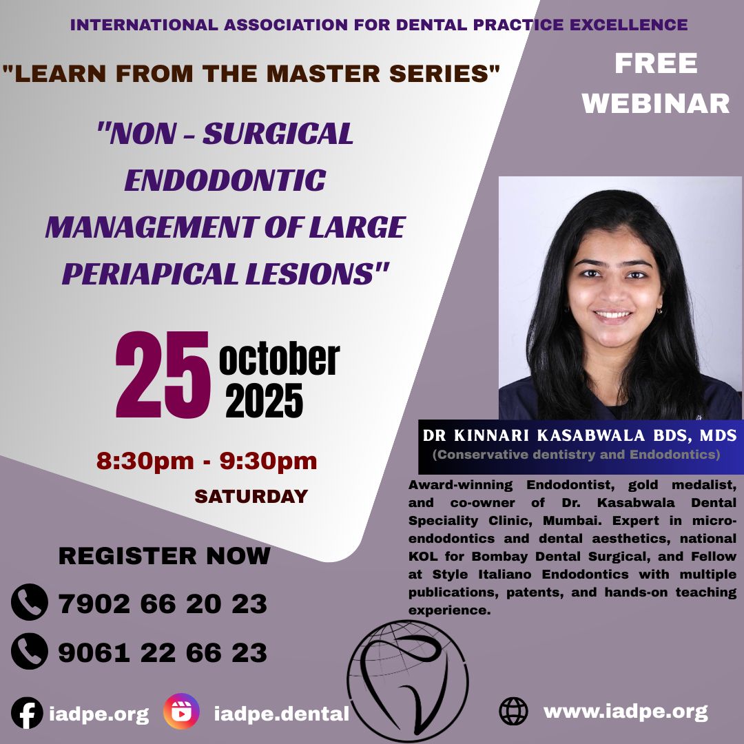 Learn from the Master Series Free Webinar by the International Association for Dental Practice Excellence (IADPE) Topic: Non-Surgical Endodontic Management of Large Periapical Lesions Date & Time: Saturday, 25 October 2025 8:30 PM – 9:30 PM Speaker: Dr. Kinnari Kasabwala, BDS, MDS Specialist in Conservative Dentistry & Endodontics Associated with Bombay Dental Surgical Accomplished educator and clinician Extensive teaching experience in advanced endodontic techniques Registration & Contact: Phone: 7902 66 20 23, 9061 22 66 23 Website: iadpe.org Instagram: @iadpe.dental