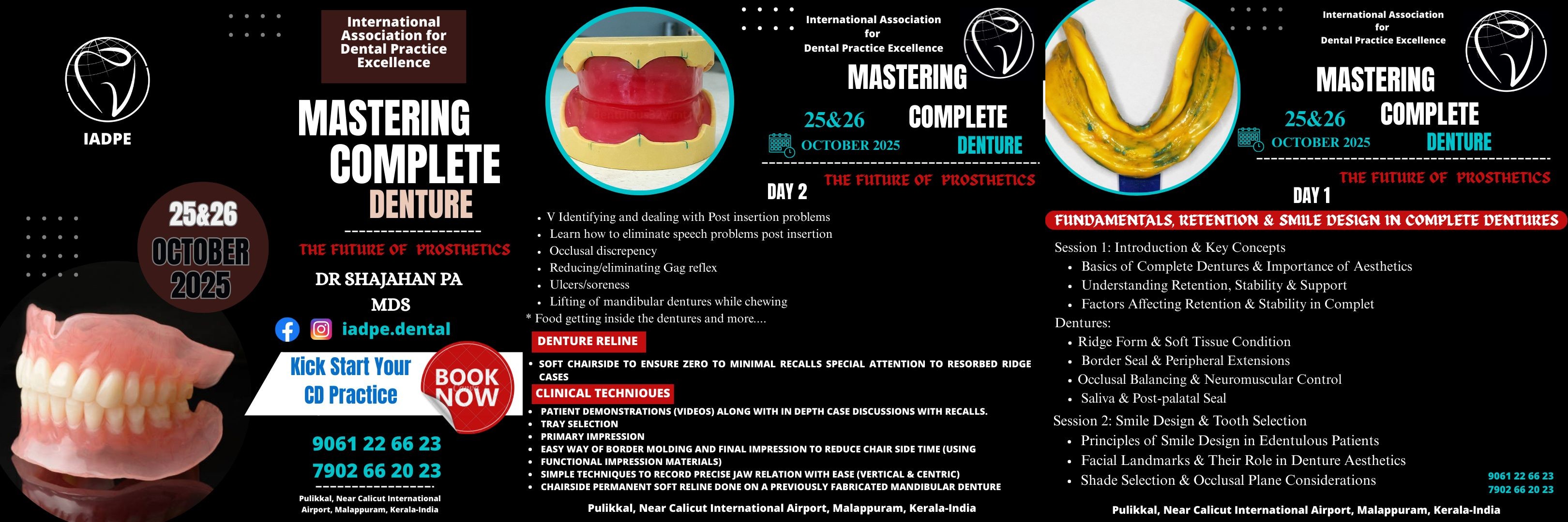 Mastering Complete Denture The Future of Prosthodontics Organized by: International Association for Dental Practice Excellence (IADPE) Date: October 25 & 26, 2023 Puthiyakavu, Near Global Institute of Advanced Dentistry, Muvattupuzha, Kerala, India Speaker: Dr. Shahajan PA, MDS (Prosthodontics) Expert in complete denture prosthesis and clinical practice enhancement Booking & Contact: Phone: 9061 26 62 23, 7902 66 20 23 Call to Action: Kick Start Your Clinical Practice — BOOK NOW Day 1 Agenda: Importance of prosthetic services in clinical practice Understanding complete denture prosthesis Diagnosis and treatment planning Impression techniques Jaw relation records Selection of teeth Try-in procedures Denture insertion Post-insertion problems Maintenance of complete denture prosthesis Day 2 Agenda: Fundamentals, Restorative & Smile Design in Complete Dentures Basics and treatment modalities Impression techniques & jaw relation recording Teeth arrangement, retention & stability Denture insertion Ridge form & soft tissue condition Clinical & lab procedures Occlusion & articulation Smile design & tooth selection Esthetic & functional parameters Importance of anterior teeth placement Clinical tips & tricks This event is ideal for dental professionals aiming to elevate their prosthodontic skills and integrate complete denture services into their practice.