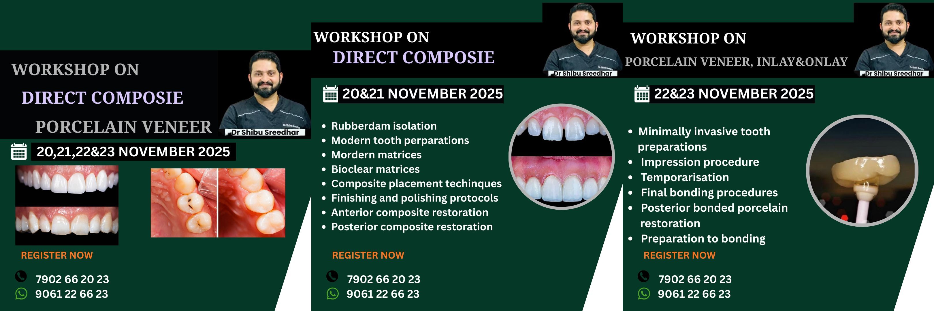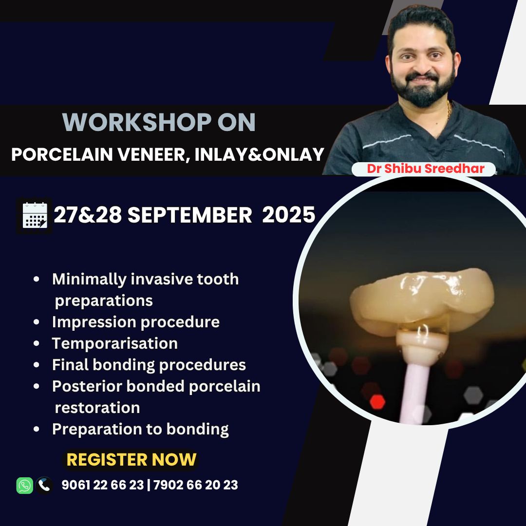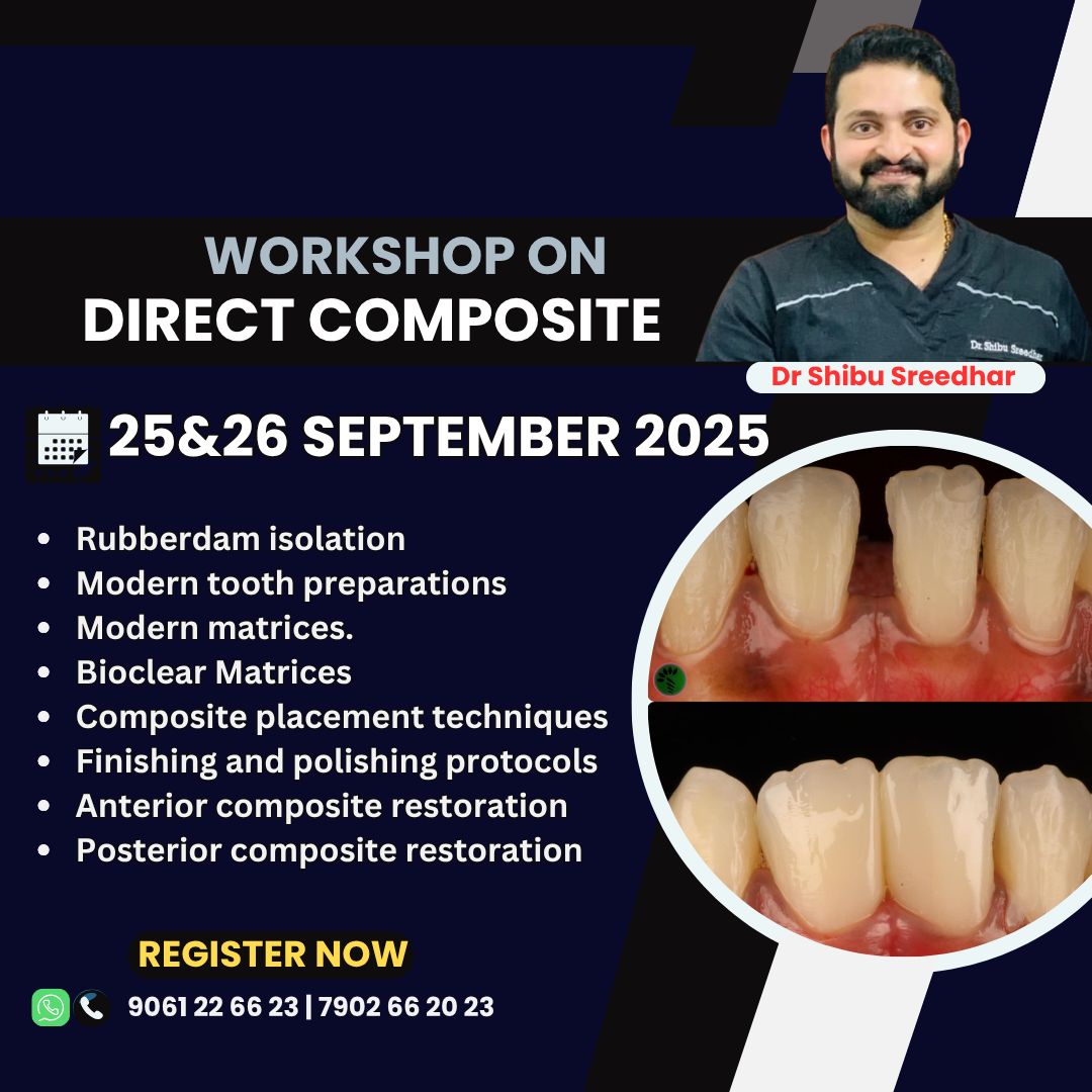 ADVANCED DENTAL WORKSHOPS WITH DR. PRIBHU SHREEDHAR Instructor: Dr. Pribhu Shreedhar Workshop Dates & Topics Direct Composite Porcelain Veneer Dates: 20th, 21st, 22nd & 23rd November 2025 Direct Composite Dates: 20th & 21st November 2025 Topics Covered: Rubberdam isolation Modern tooth preparations Modern matrices Bioclear matrices Composite placement techniques Finishing and polishing protocols Anterior composite restoration Posterior composite restoration Porcelain Veneer, Inlay & Onlay Dates: 22nd & 23rd November 2025 Topics Covered: Minimally invasive tooth preparations Impression procedure Temporisation Final bonding procedures Posterior bonded restoration Preparation to bonding Contact for Registration: 7902 66 20 23 | 9061 26 66 23