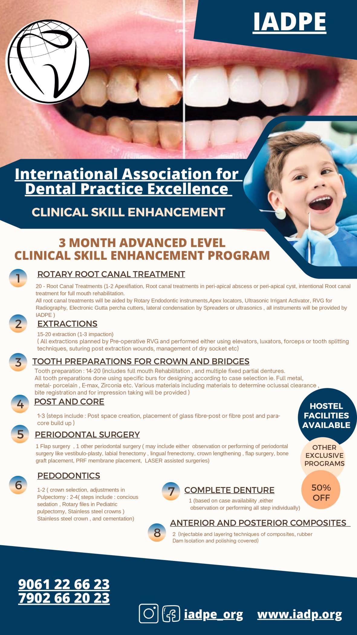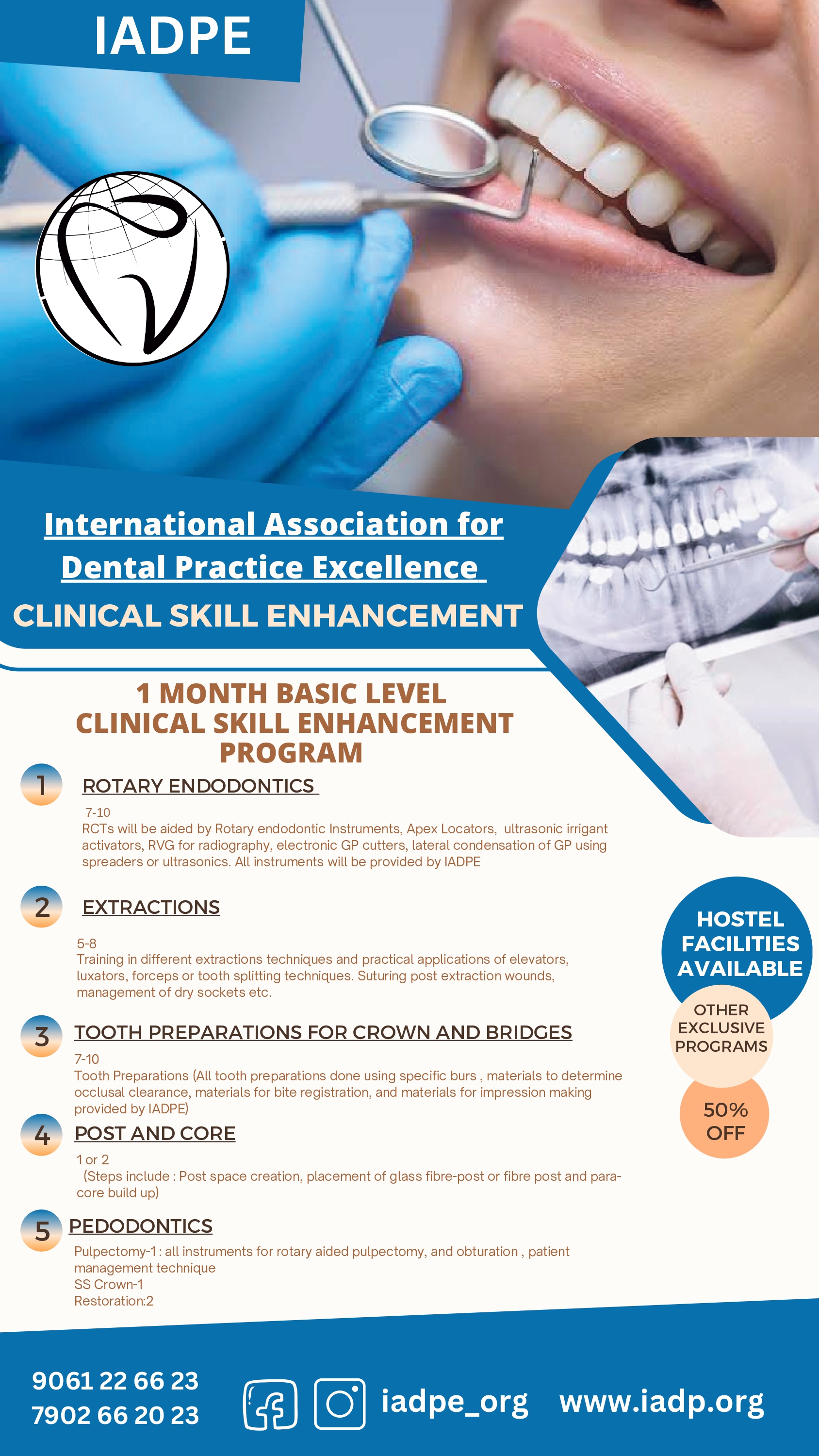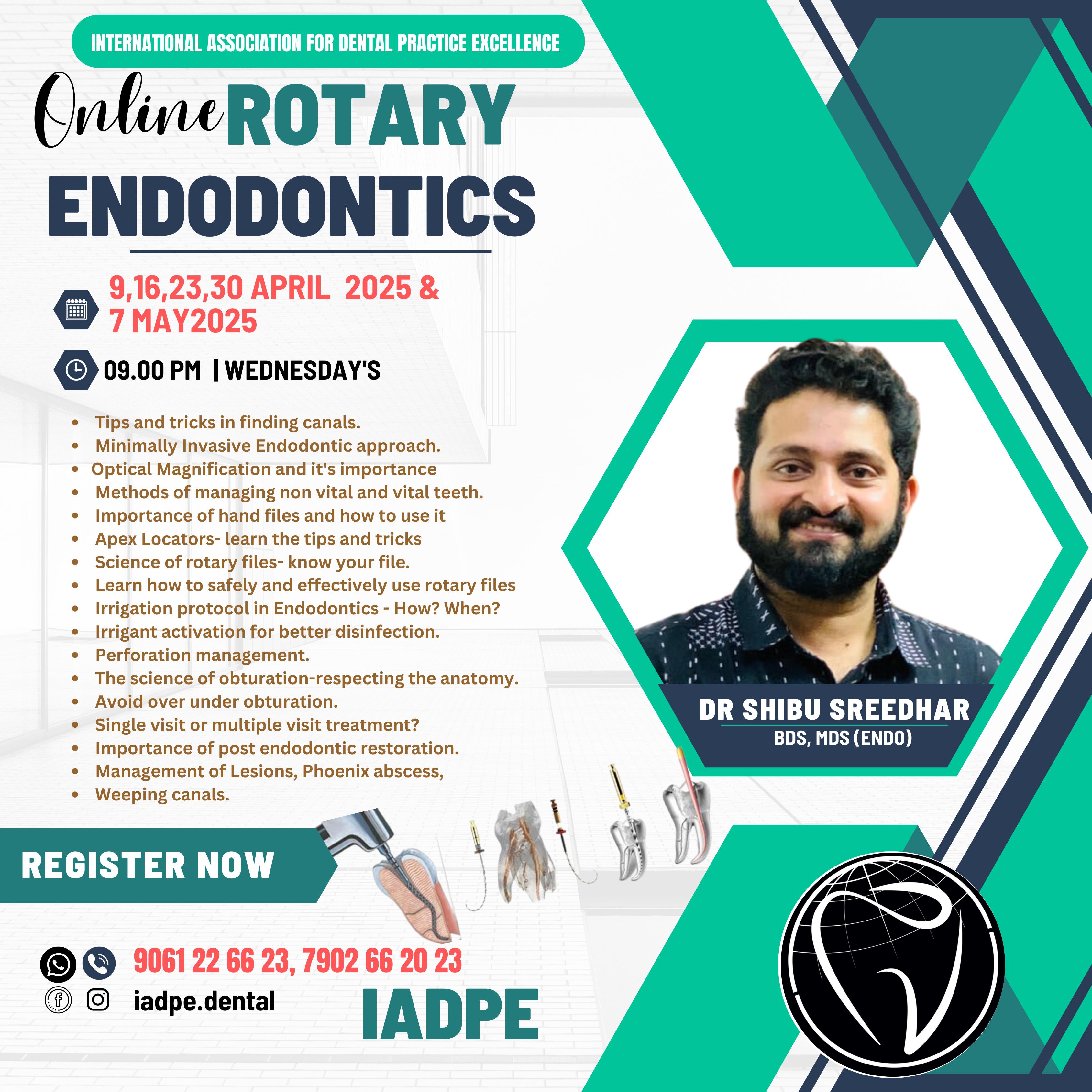 9,16,23,30 APRIL 2025 & 7 MAY 2025 09.00 PM | WEDNESDAY'S Course Agenda: Tips and tricks in finding canals. Minimally Invasive Endodontic approach. Optical Magnification and it's importance Methods of managing non vital and vital teeth. Importance of hand files and how to use it Apex Locators- learn the tips and tricks Science of rotary files- know your file. Learn how to safely and effectively use rotary files Irrigation protocol in Endodontics - How? When? Irrigant activation for better disinfection. Perforation management. The science of obturation-respecting the anatomy. Avoid over under obturation. Single visit or multiple visit treatment? Importance of post endodontic restoration. Management of Lesions, Phoenix abscess, Weeping canals. REGISTER NOW: 9061 22 66 23, 7902 66 20 23 IADPE