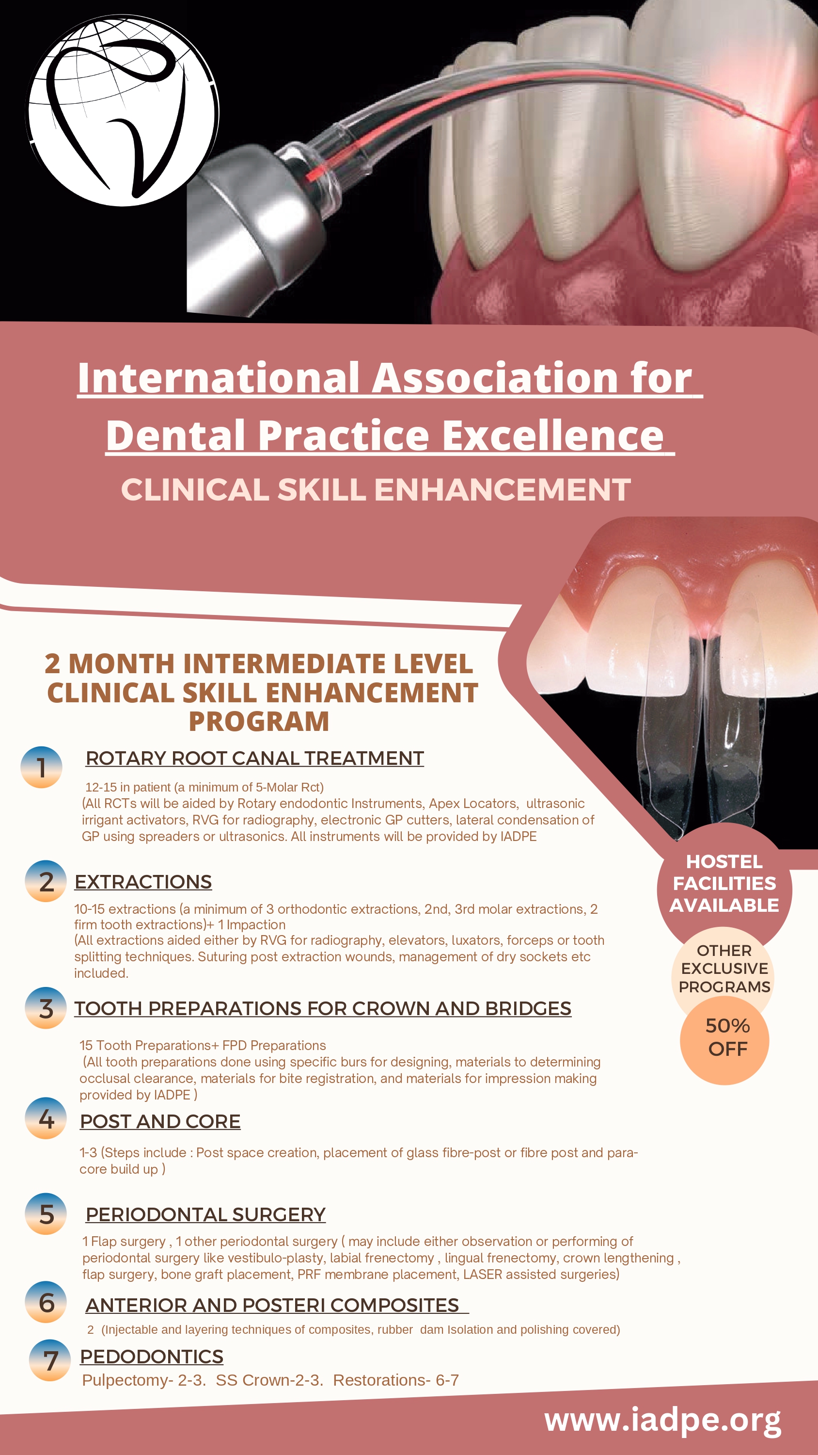 Course Agenda ROTARY ROOT CANAL TREATMENT EXTRACTIONS TOOTH PREPARATIONS FOR CROWN AND BRIDGES 12-15 in patient (a minimum of 5-Molar Rct) (All RCTs will be aided by Rotary endodontic Instruments, Apex Locators, ultrasonic irrigant activators, RVG for radiography, electronic GP cutters, lateral condensation of GP using spreaders or ultrasonics. All instruments will be provided by IADPE. EXTRACTIONS 10-15 extractions (a minimum of 3 orthodontic extractions, 2nd, 3rd molar extractions, 2 firm tooth extractions)+ 1 Impaction (All extractions aided either by RVG for radiography, elevators, luxators, forceps or tooth splitting techniques. Suturing post extraction wounds, management of dry sockets etc included. TOOTH PREPARATIONS FOR CROWN AND BRIDGES 15 Tooth Preparations+ FPD Preparations (All tooth preparations done using specific burs for designing, materials to determining occlusal clearance, materials for bite registration, and materials for impression making provided by IADPE). POST AND CORE 1-3 (Steps include : Post space creation, placement of glass fibre-post or fibre post and para core build up). PERIODONTAL SURGERY 1 Flap surgery , 1 other periodontal surgery ( may include either observation or performing of periodontal surgery like vestibulo-plasty, labial frenectomy , lingual frenectomy, crown lengthening , flap surgery, bone graft placement, PRF membrane placement, LASER assisted surgeries) ANTERIOR AND POSTERI COMPOSITES 2 (Injectable and layering techniques of composites, rubber dam Isolation and polishing covered) PEDODONTICS Pulpectomy- 2-3. SS Crown-2-3. Restorations- 6-7