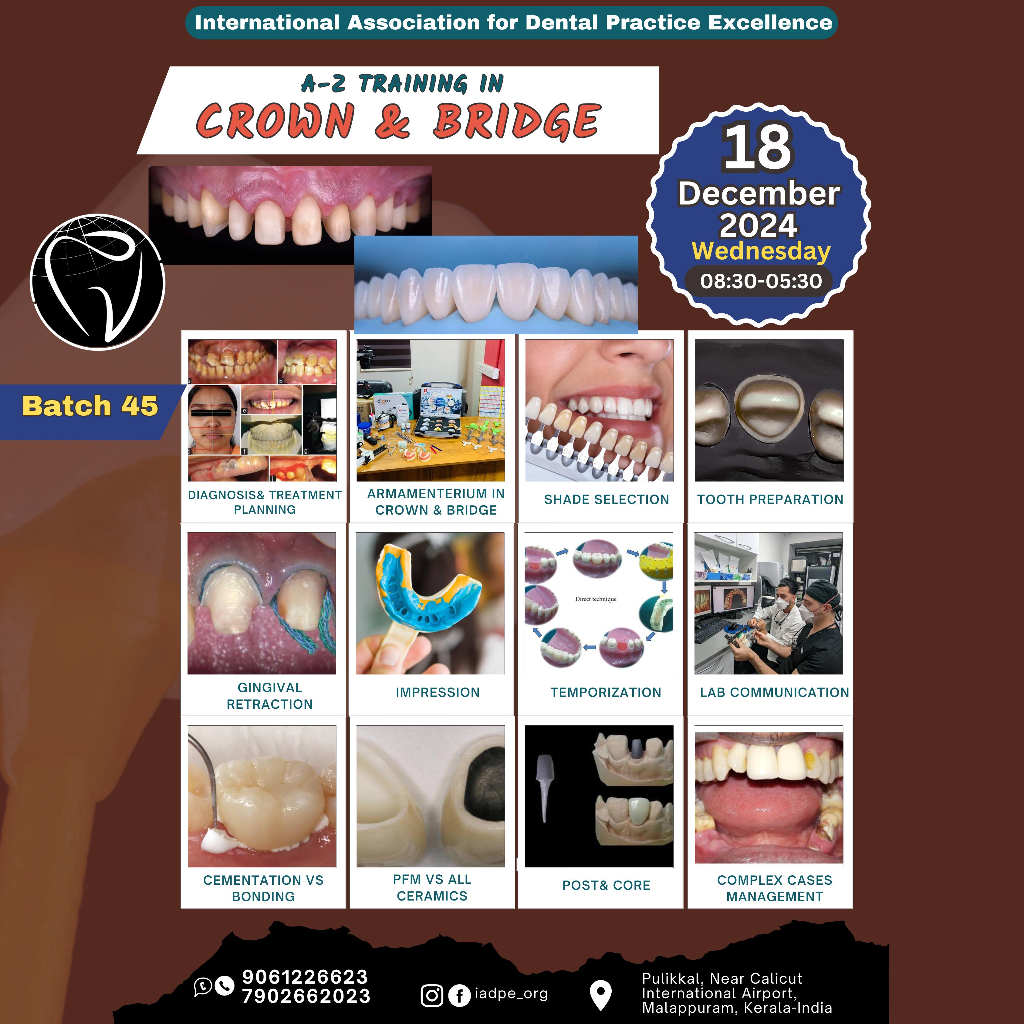 A-Z Training in Crown & Bridge(Batch 45) (18th December 2024) (Wednesday 8:30-5:30) Course Agenda Diagnosis & Treatment Planning Armamenterum in Crown & Bridge Shade Selection Tooth Preparation Gingival Retraction Impression Temporization Lab Communication Cementation vs Bonding PFM vs All Ceramics Post & Core Complex Cases Management Contact & Book Now: 9061226623, 7902662023