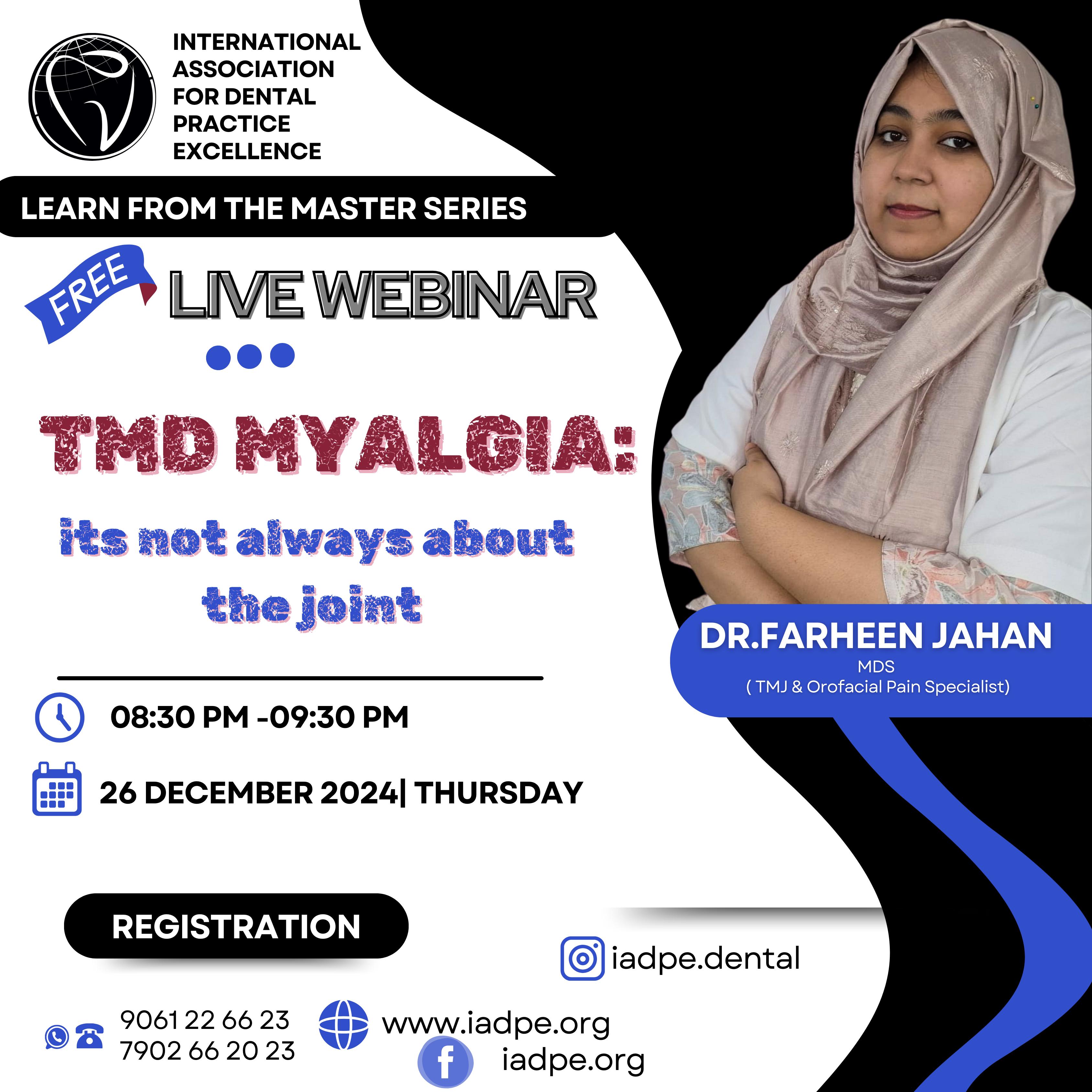 DR FARHEEN JAHAN MDS (TMJ & Orofacial Pain Specialist) Webinar Details 26th December 2024-Thursday 08:30 PM - 09:30PM Contact to Register: 9061226623, 7902662023