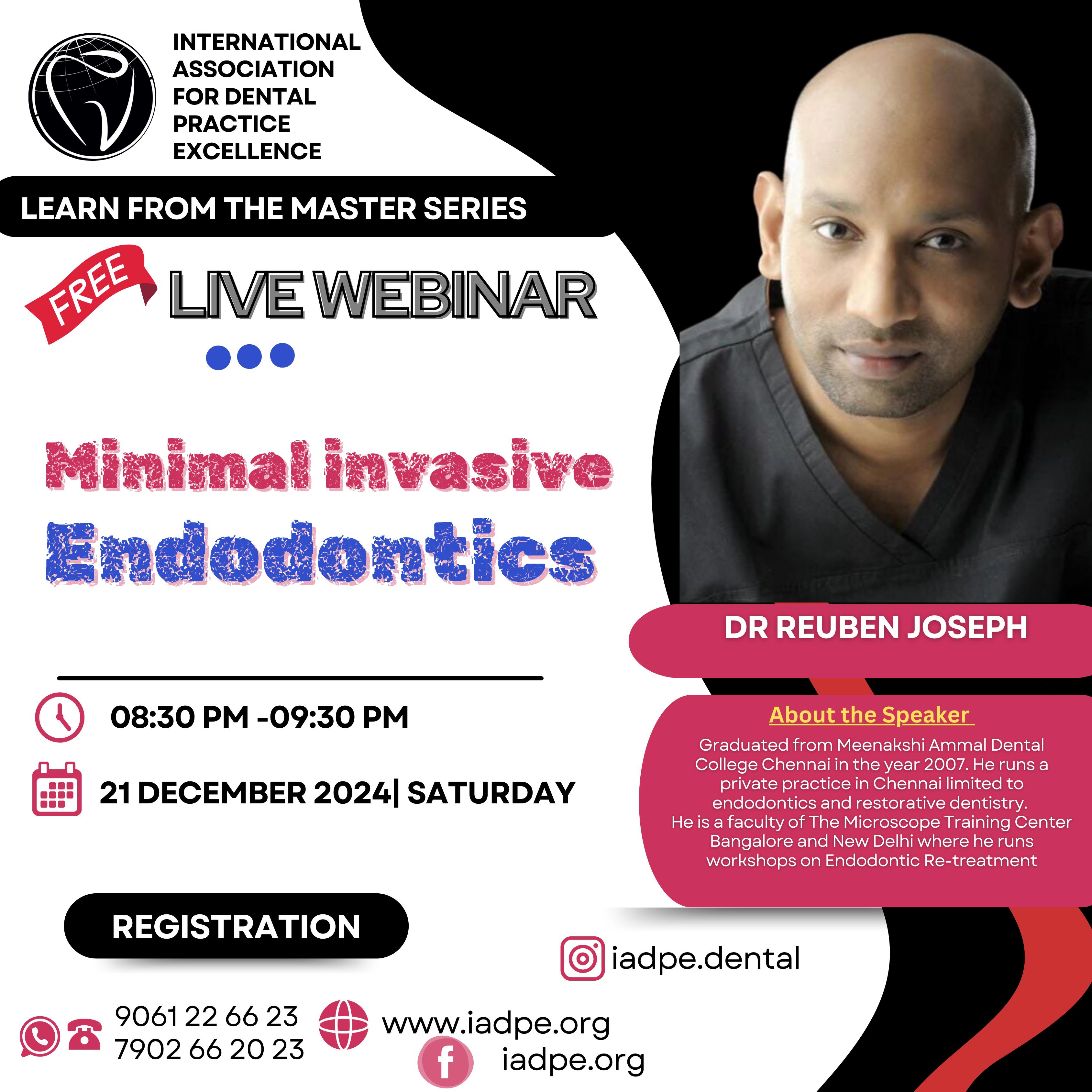 Dr Reuben Joseph Graduated from Meenakshi Ammal Dental College Chennai in the year 2007. He runs a private practice in Chennai limited to Endodontics and Restorative Dentistry. He is a faculty of The Microscope Training Center Banglore and New Delhi where he runs workshops on Endodontics Re-treatment. Webinar Details 21st December 2024-Saturday 08:30 PM - 09:30 PM Contact to Register: 9061226623, 7902662023