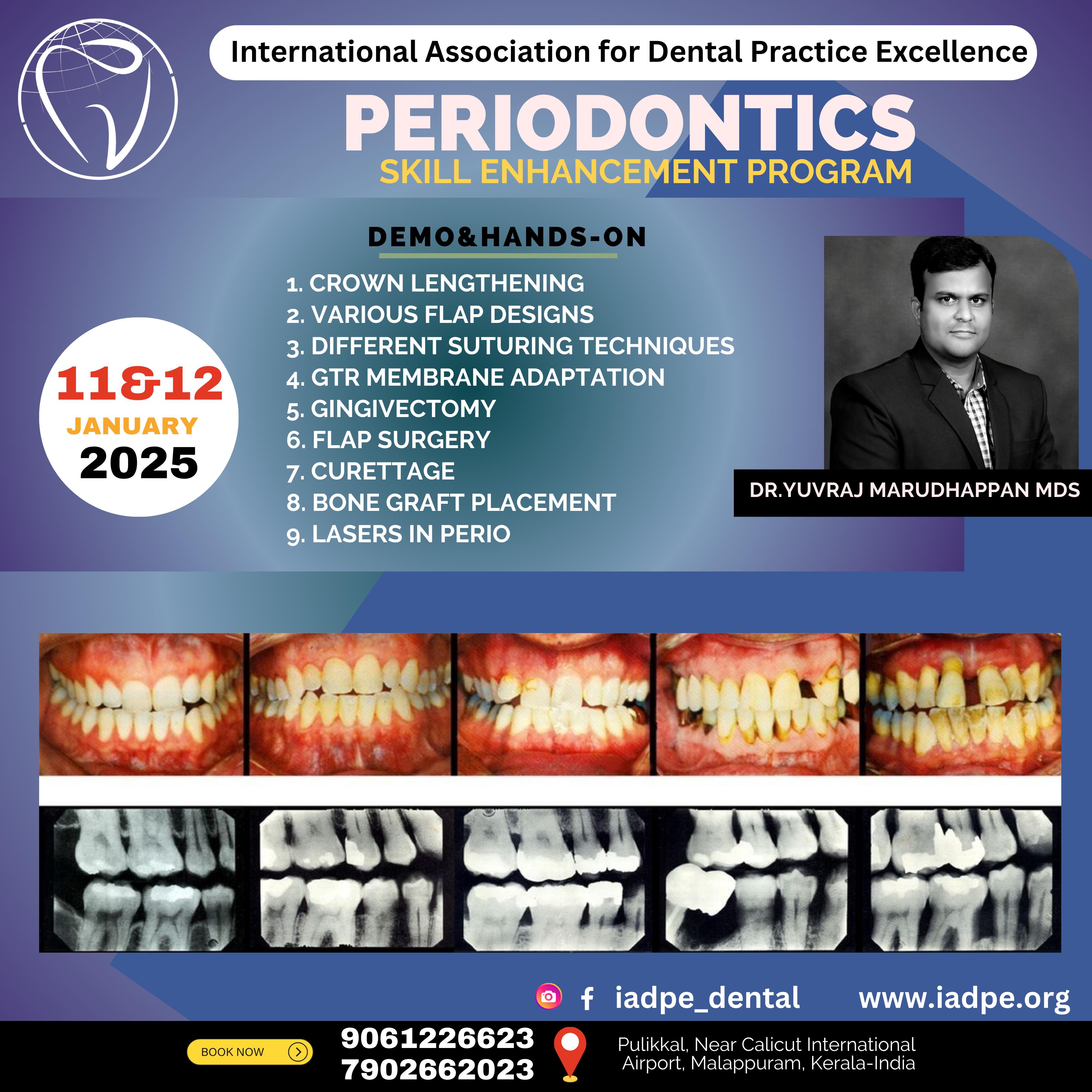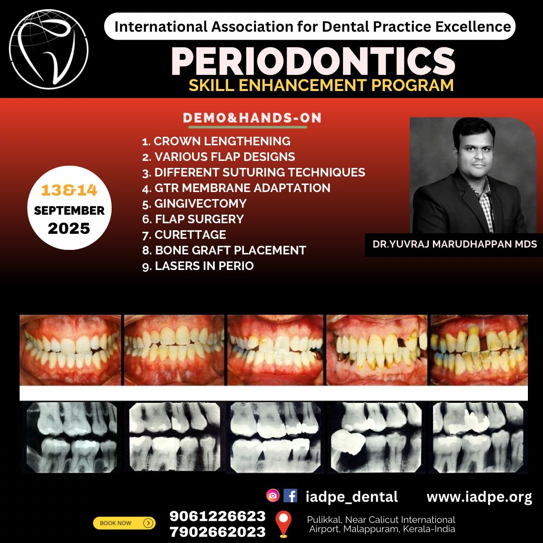 DENTAL SKILL ENHANCEMENT PROGRAM – PERIODONTICS Date: November 8 & 9, 2025 Instructor: Dr. Yuvraj Marudhapppan MDS Location: Pulikkal, Near Calicut International Airport, Malappuram, Kerala – India Website: www.iadpe.org Contact: 9061 22 66 23 | 7902 66 20 23 Instagram: @iadpe_dental Hands-on Skills Covered: Crown Lengthening Various Flap Designs Different Suturing Techniques GTR Membrane Adaptation Gingivectomy Flap Surgery Curettage Bone Graft Placement Lasers in Perio