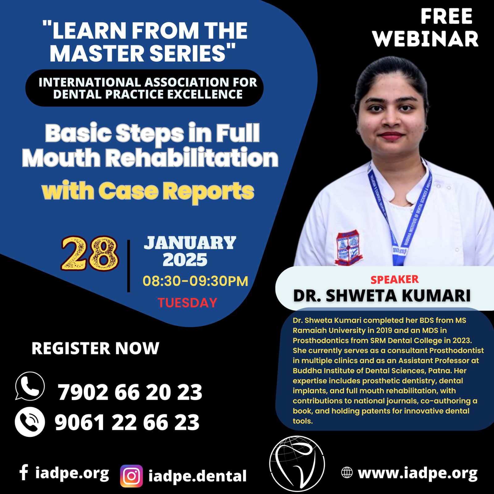 Free Webinar: Bioclear Concept Learn from the Master Series – IADPE Date & Time: Saturday, December 6, 2025 8:30 PM – 9:30 PM IST Speaker: Dr. Prateik Gupta, BDS, Masters (Lasers), PGCOI Known as the Bioclear Man of India Expert in dental aesthetics and microscope-based restorative dentistry Trained under Dr. David Clark Pioneer in promoting the Bioclear concept in India Organized by: International Association for Dental Practice Excellence (IADPE) Registration & Contact: 9061 22 66 23 9061 66 20 23 Social Media & Website: Instagram: @iadpe.org Facebook: iadpe.dental Website: www.iadpe.org