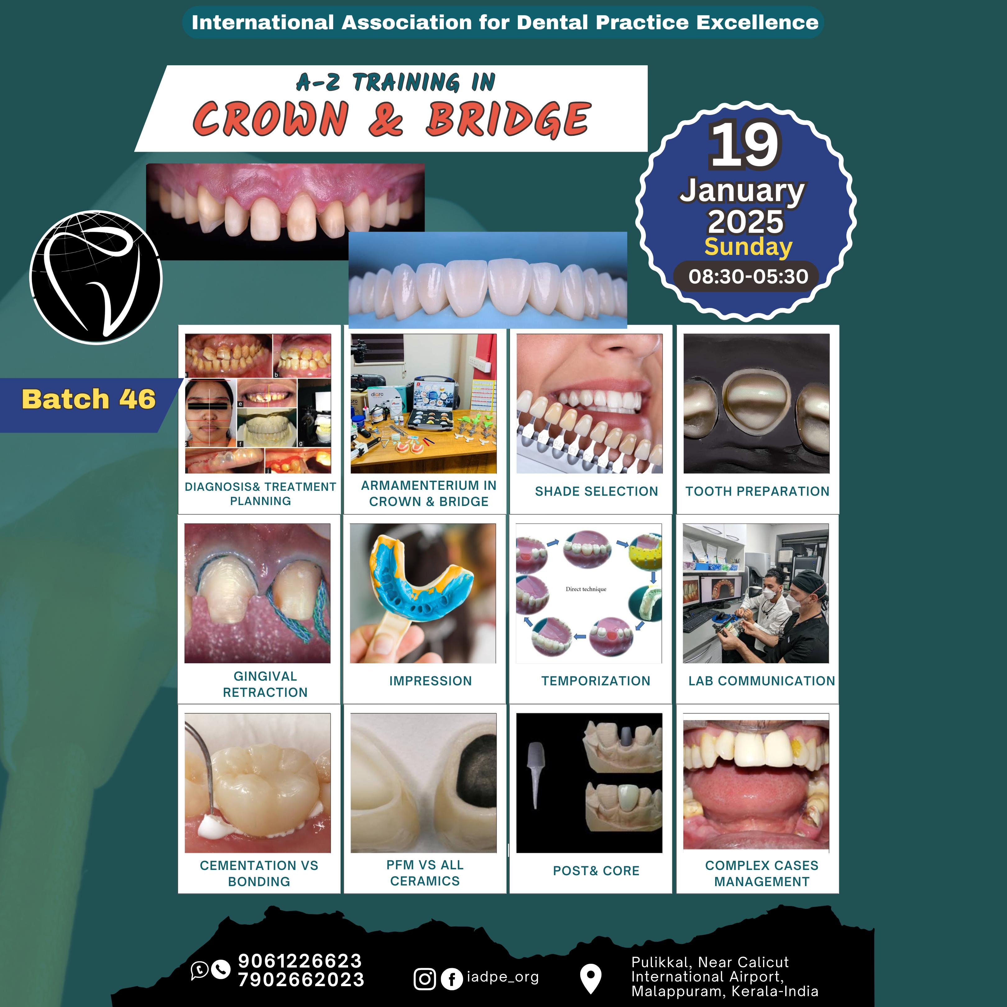 A-Z Training in Crown & Bridge(Batch 46) (19th January 2025) (Wednesday 8:30-5:30) Course Agenda Diagnosis & Treatment Planning Armamenterum in Crown & Bridge Shade Selection Tooth Preparation Gingival Retraction Impression Temporization Lab Communication Cementation vs Bonding PFM vs All Ceramics Post & Core Complex Cases Management Contact & Book Now: 9061226623, 7902662023