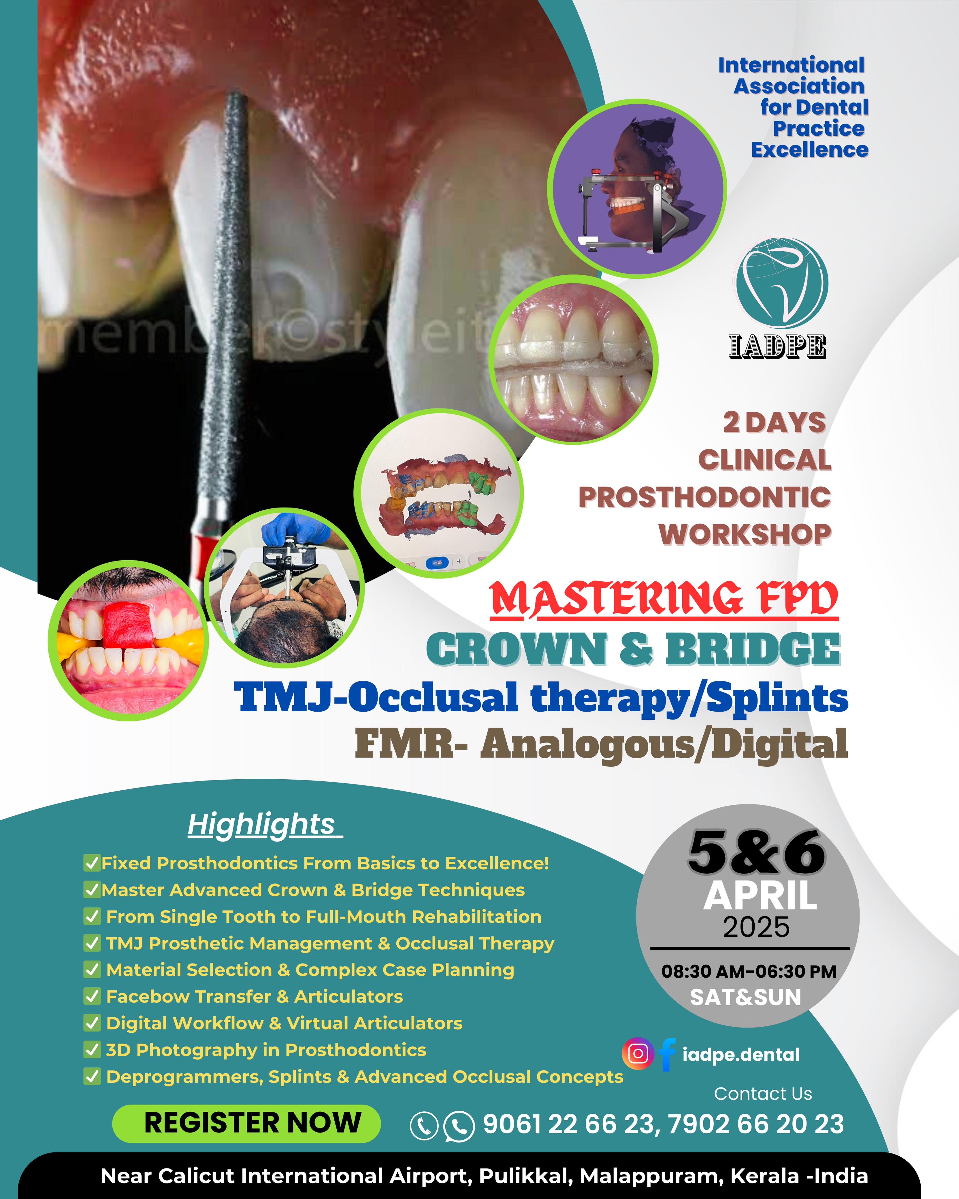 5TH SUNDAY OCTOBER 2025 08:30 AM - 05:30 PM DEMO & HANDS-ON *DIFFERENT TREATMENT OPTIONS & TREATMENT PLANNING IN FPD INTRUMENTS USED IN IN TOOTH PREPARATION SHADE SELECTOR. *DIFFERENCE IN TOOTH PREPARATION BETWEEN ALL CERAMICS AND PFM GINGIVAL RETRACTION HIGHLIGHTS ABOUT FINAL IMPRESSION LAB COMMUNICATION & CEMENTATION COMPLEX CASES-DISCUSSIONS. CONTACT US: 9061 22 66 23 7902 66 20 23