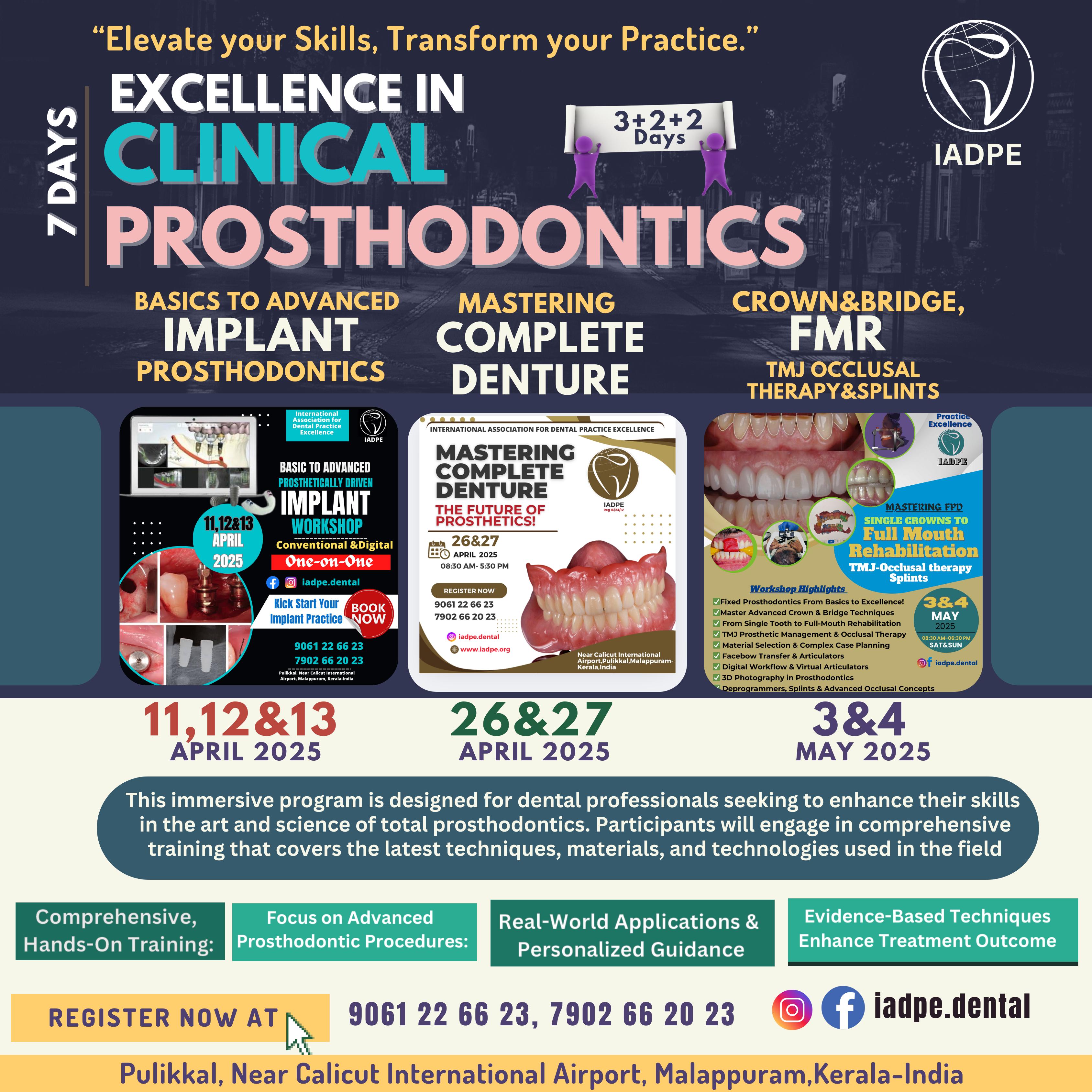 Elevate Your Skills, Transform Your Practice! EXCELLENCE IN CLINICAL PROSTHODONTICS – A comprehensive, hands-on training program designed for dental professionals seeking to master cutting-edge prosthodontic techniques. Program Highlights: Basics to Advanced Implant Prosthodontics (April 11, 12 & 13) Mastering Complete Dentures – The Future of Prosthetics! (April 26 & 27) Crown & Bridge | FMR | TMJ Occlusal Therapy & Splints (May 3 & 4) Why Join? Hands-on Training with Real-World Applications Learn the Latest Techniques, Materials & Digital Advancements Evidence-Based Prosthodontics for Predictable Outcomes Venue: Pulikkal, Near Calicut International Airport, Kerala-India Register Now: 9061 22 66 23 | 7902 66 20 23 Limited seats available! Take your prosthodontic practice to the next level. *DM or WhatsApp us now!* 9061226623 Click to Chat Now! Follow @iadpe.dental for updates!